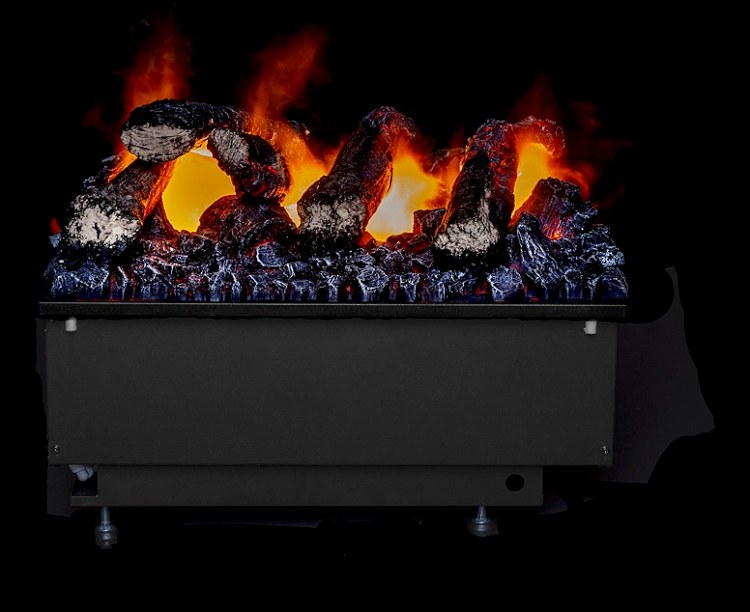 De haard is leverbaar met een optionele houtset met gloeieffect. Standaard wordt de haard geleverd met een vlakke zwarte plaat zodat u de opstelling zelf kunt decoreren.