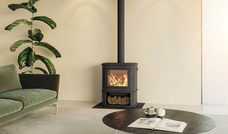 Stijlvolle speksteen houtkachel met een hoog vermogen.