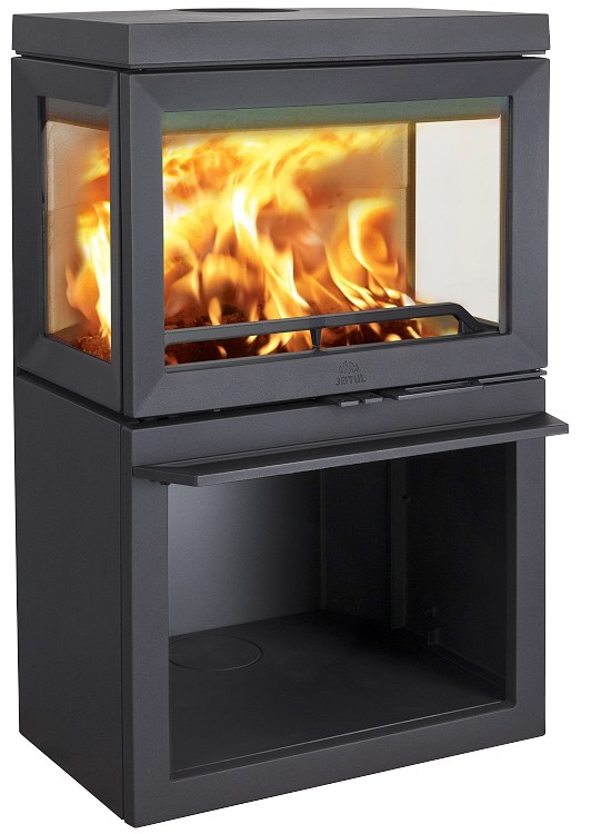 Gietijzeren houtkachel met zijglas voor een meerzijdige vuurbeleving. Er is een groot houtvak onder de kachel aanwezig.