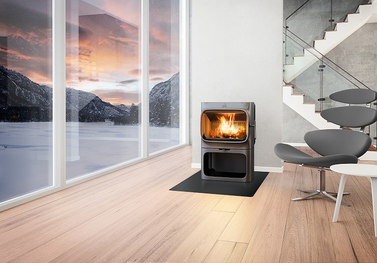 Houtkachel met groot glasruit en veel vermogen.