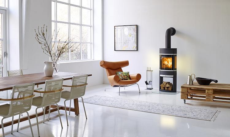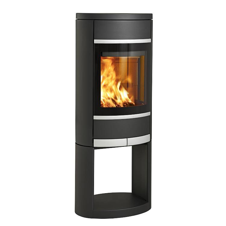 Houtkachel met doorkijkbasis en met aluminium accenten.